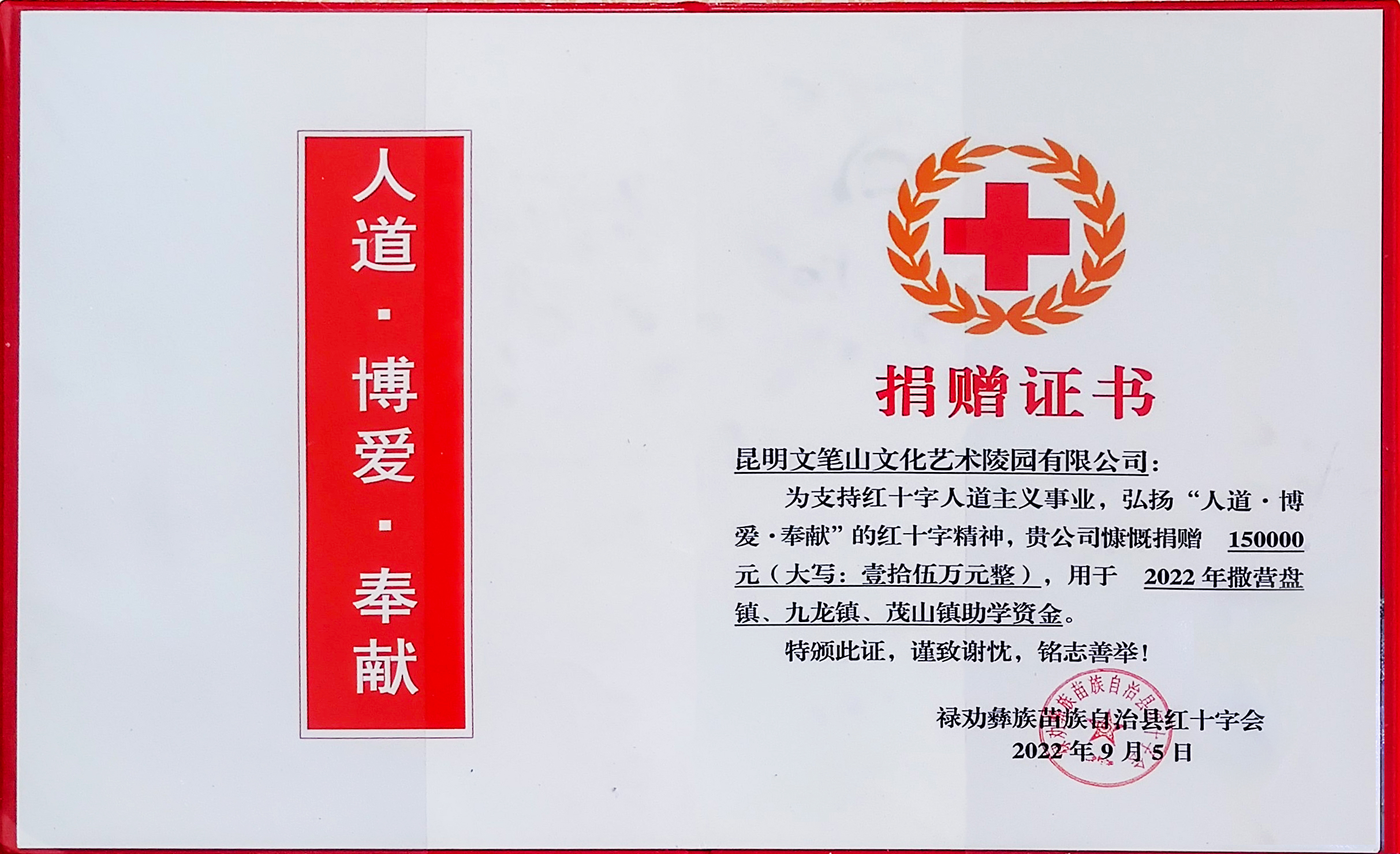 昆明文笔山文化艺术陵园有限公司(下辖文笔山殡仪馆、文笔山文化艺术陵园),是经云南省民政厅、昆明市民政局审核批准,由禄劝县民政局主管,专业从事殡仪、殡葬服务的企业,公司于2009年7月成立,由禄劝县人民政府以招商引资的方式进入,公司投资兴建占地500亩融生态园林、景观文化、殡葬服务、殡仪服务为一体的综合企业,以建设滇中北部地区规模最大,设施最全、环境最美、品味最高的生态艺术陵园。作为我市陵园殡葬行业中的后起之秀,公司将以“推动殡葬改革、提升殡葬文化、节约土地资源、弘扬孝道美德”为己任,恪守信誉、大胆创新,精心打造全新的殡葬服务来回报社会。